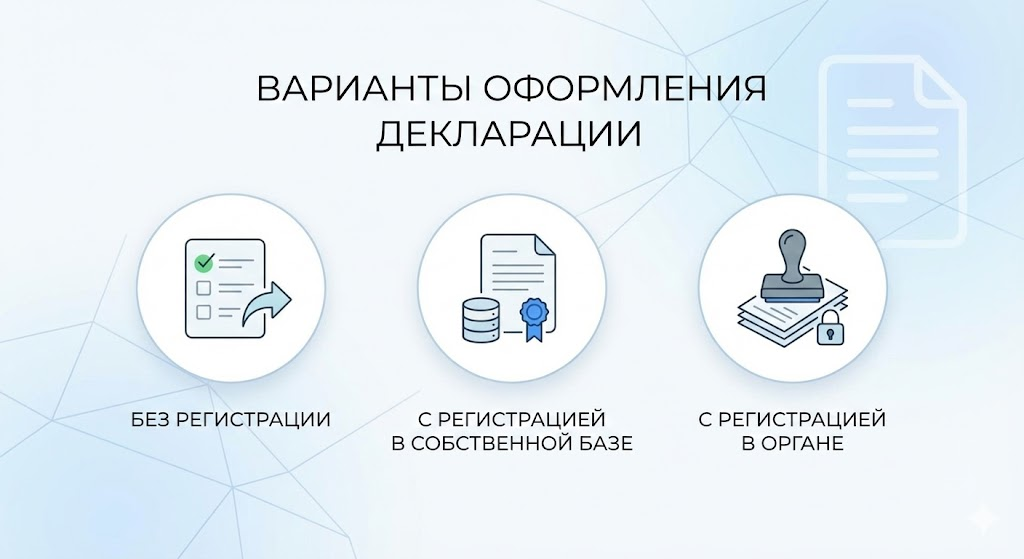 Этот вариант мы называем «Самым правильным и простым». Суть в том, что по большинству технических регламентов (особенно по Модулю А) ответственность за декларацию несет производитель или его уполномоченный представитель. Закон не требует обязательной печати стороннего органа на этом документе.